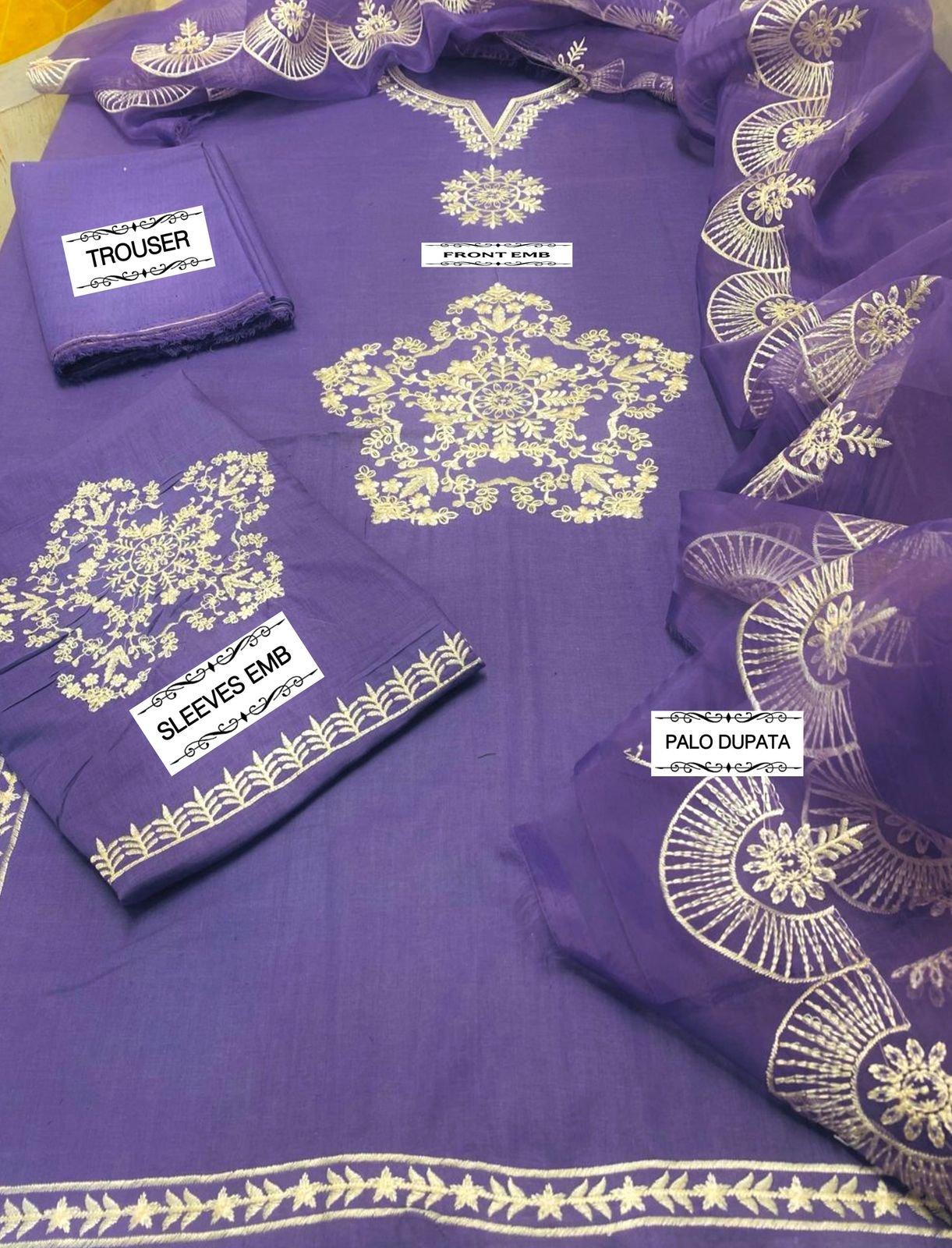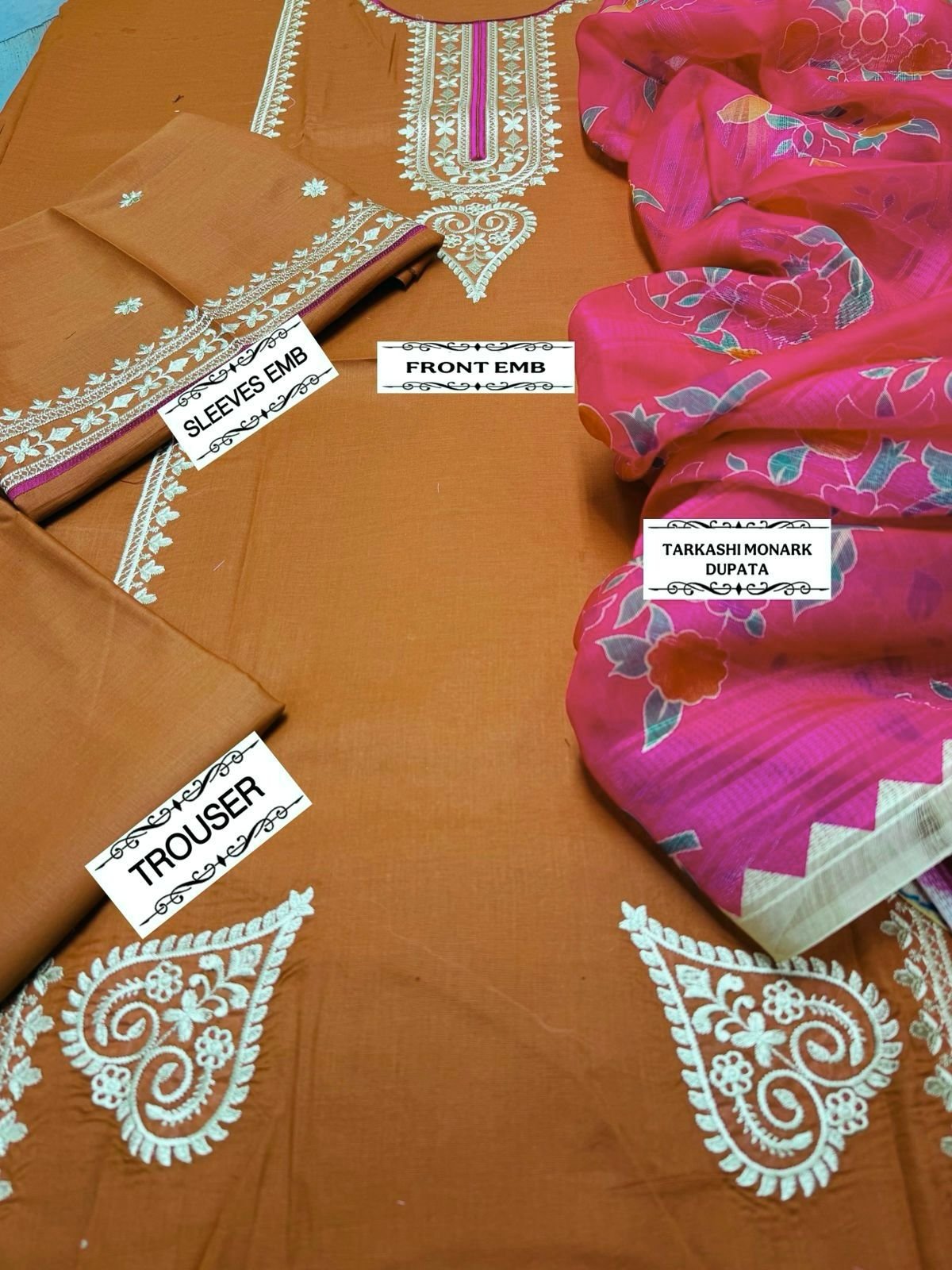 🌻LAWN AIR JET BEST WORLD CLASS QUALITY STUFF 🌻front Full Emb 🌻Oragnza Emb And Tarkashi dupata 🌻 Seleeves Emb 🌻Head skip Emb 🌻dyed trouser