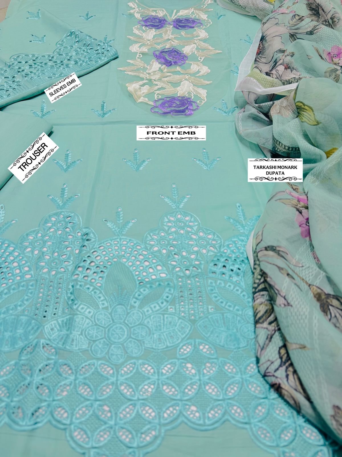 🌻LAWN AIR JET BEST WORLD CLASS QUALITY STUFF 🌻front Full Chickenkari Emb 🌻Tarkashi monark 🌻 Seleeves Emb 🌻Dyed trouser 🌻 Damn boring Emb